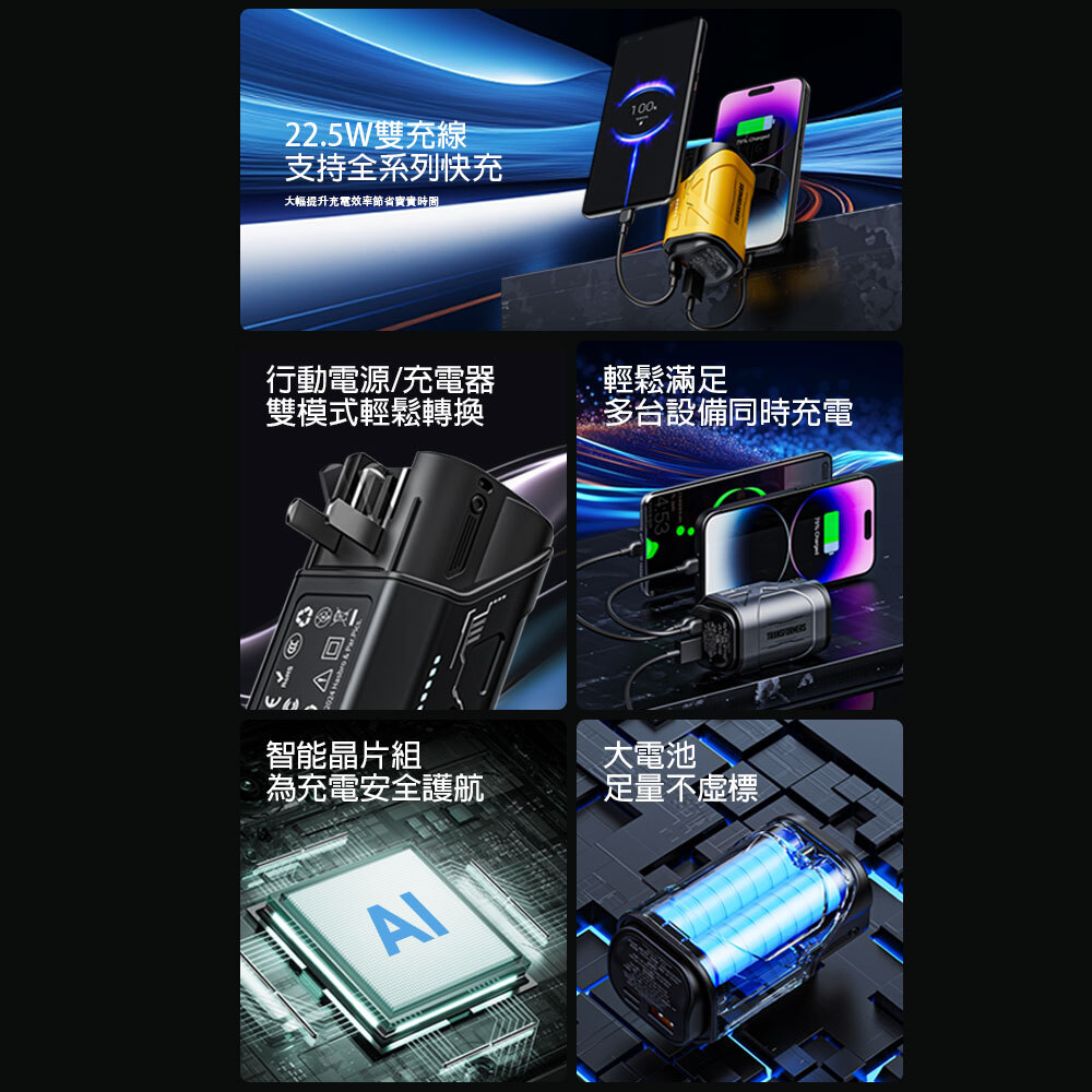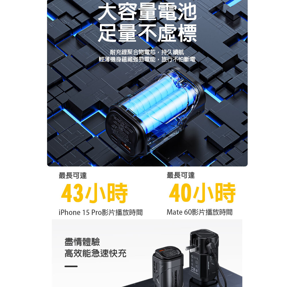多效合一設計:創新結合行動電源與充電插頭的二合一設計,並配備可拆卸的「雙向快充掛繩線」,一顆搞定所有補電需求,出門再也不用攜帶繁雜的線材與充電頭。